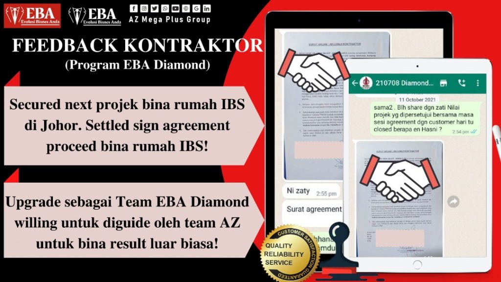 Meh admin share result panas-panas dari Team EBA Diamond yang hebat ni. Alhamdulillah dapat secured next project di Johor, Darul Takzim. Dah settle sign agreement and tunggu nak proceed je dengan bina rumah IBS MeGGa ni. Amazing!Dengan proven RESULTS , TIPS , STRATEGI , PENGALAMAN yang dibawa oleh AZ Mega Plus Group mampu membantu kontraktor di bawah program Mentorship Diamond ini untuk membina brand mereka di dalam market IBS di Malaysia. Bukan beratus ribu nilai projek yang kami dah bantu , tetapi dengan nilai projek JUTA pun mampu dicapai oleh TEAM DIAMOND dengan tunjuk ajar dari A-Z oleh team AZ. Trust the Process adalah kuncinya! Anda nak diguide seperti mereka ?