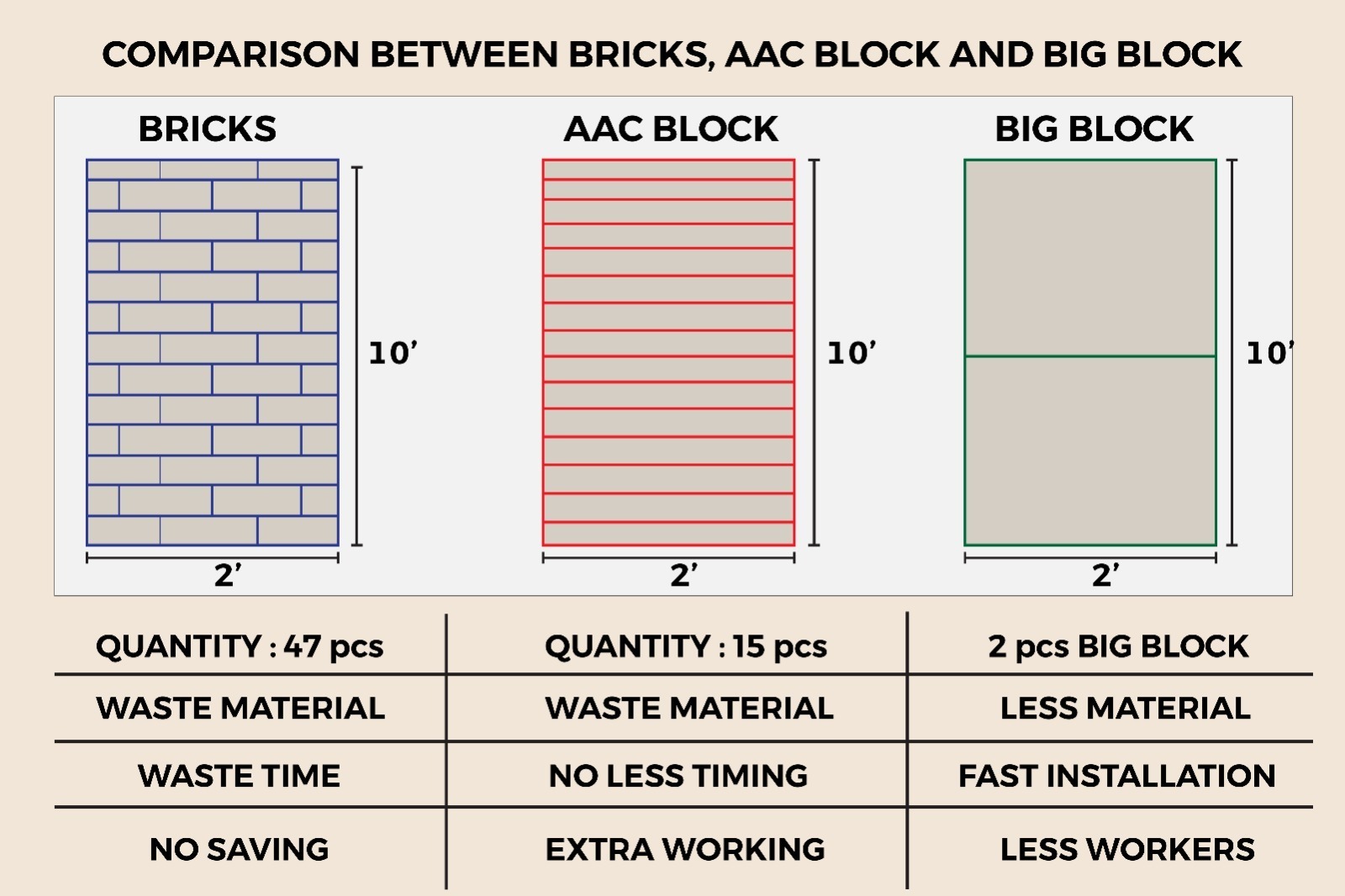 Kelebihan utama IBS V-PLUS BIG BLOCK ialah ia hanya memerlukan 3 orang pekerja sahaja untuk proses pemasangan, berbeza dengan block biasa yang lazimnya memerlukan tenaga kerja lebih ramai. Hal ini secara langsung membantu mengurangkan kos upah pekerja, menjadikan projek lebih murah dan mampu menjimatkan perbelanjaan. Pada masa yang sama, ia juga mempercepatkan tempoh pembinaan dan memberikan lebih banyak fleksibiliti kepada kontraktor serta pemaju. IBS V-PLUS BIG BLOCK turut mempunyai ciri penebat haba yang baik dan tahan terhadap air yang memastikan struktur binaan lebih selesa, selamat serta tahan cuaca.
