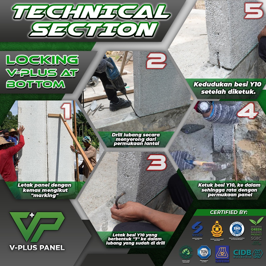 Seterusnya, locking V-Plus at bottom juga digunakan sama seperti locking at top, sistem locking ini digunakan pada bahagian bawah panel. Ia bertujuan menperkukuhkan lagi antaranya pemasangan dinding IBS V-Plus Panel untuk memastikan panel berdiri tegak dan tidak bergerak semasa proses pembinaan seterusnya. Penggunaan sistem locking yang sesuai seperti surface locking, top locking dan bottom locking sangat penting dalam pemasangan IBS V-Plus Panel. Ia bukan sahaja memastikan keteguhan struktur, tetapi juga membantu mempercepatkan proses pemasangan dan meningkatkan keselamatan dalam pembinaan.