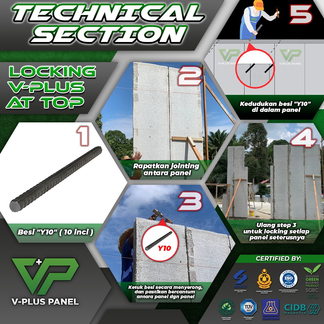 Selain itu, locking V-Plus at top juga sering digunakan di bahagian atas panel IBS, terutamanya apabila panel disusun menegak. Sistem ini memastikan panel terikat dengan baik pada struktur atas. Oleh itu, pemahaman tentang jenis-jenis locking yang digunakan amatlah penting untuk keselamatan dan kualiti pembinaan.Penyambungan ini membolehkan panel disatukan dengan lebih kemas dan tepat, sekaligus memudahkan kerja pemasangan serta menjimatkan masa.
