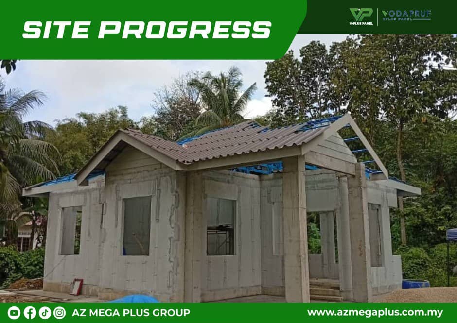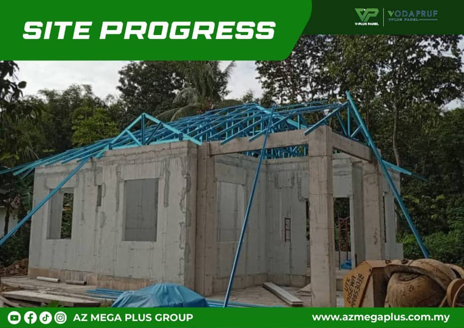 Alhamdulillah, the first IBS V-PLUS PANEL house project in Salor, Pasir Mas, is progressing smoothly! The 840 sqft home, featuring 3 bedrooms and 2 bathrooms, has now completed its roofing installation.